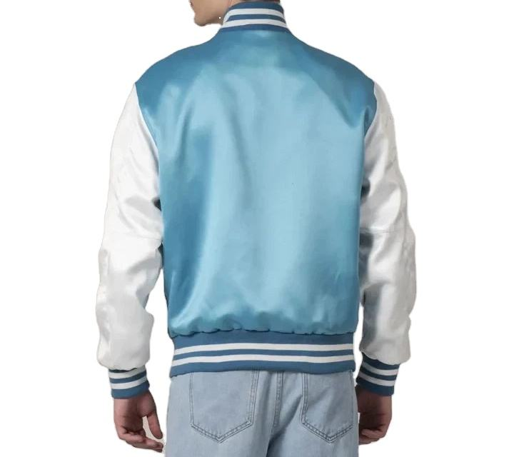 Blouson aviateur universitaire en satin bleu ciel pour hommes avec manches blanches à l'avant