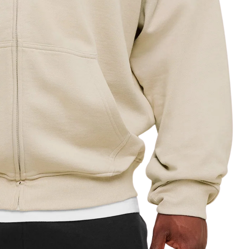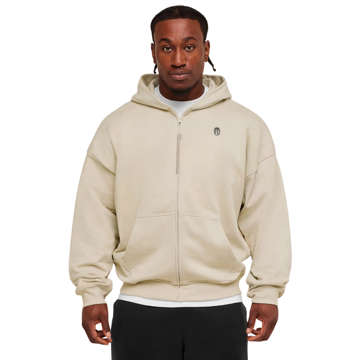 Sweat-shirt à capuche zippé gris galet surdimensionné pour homme, en molleton épais, coupe décontractée, style streetwear.