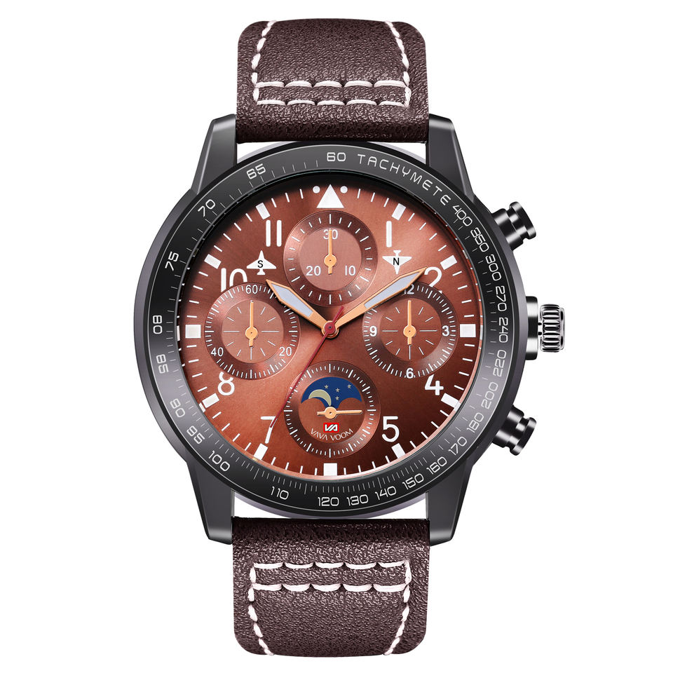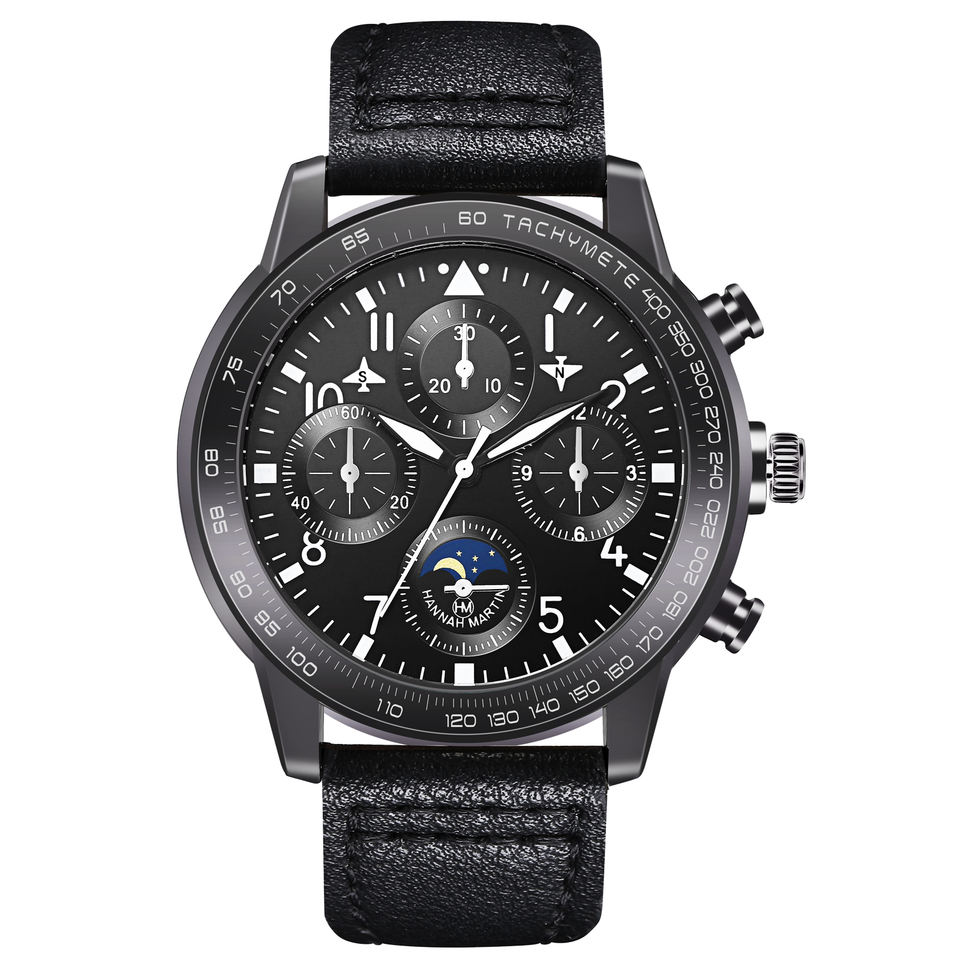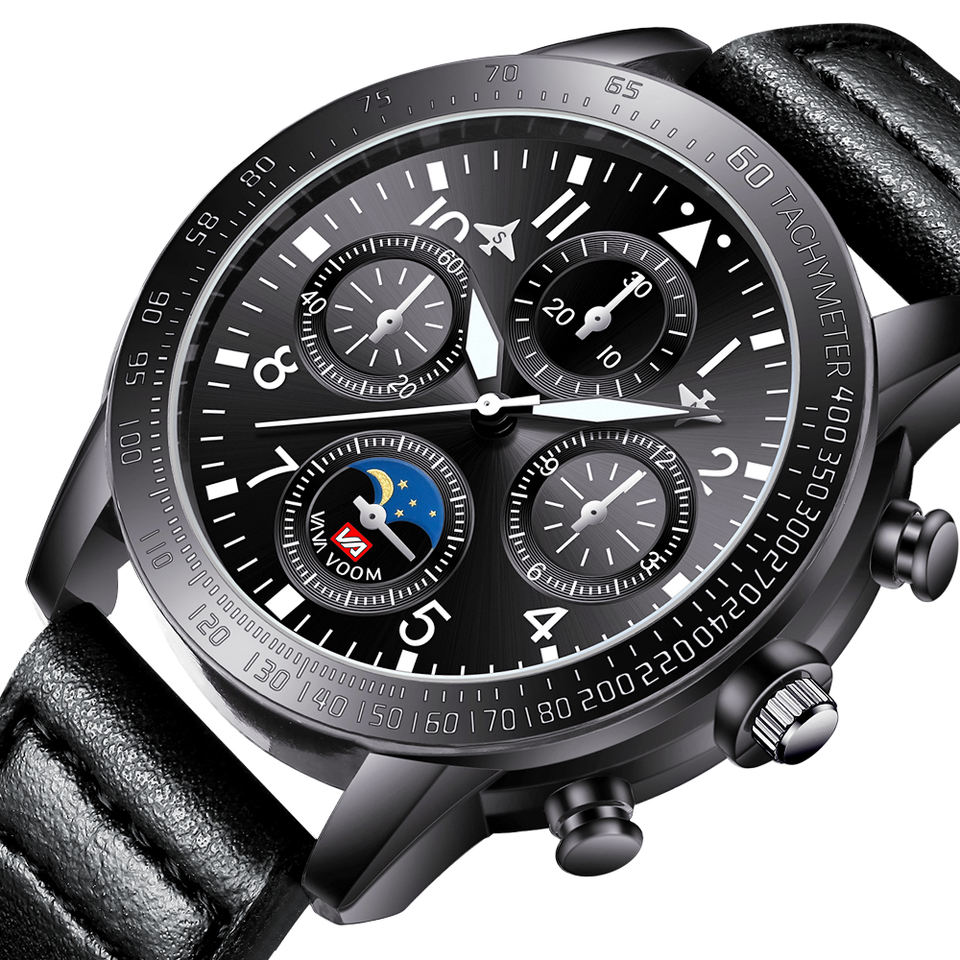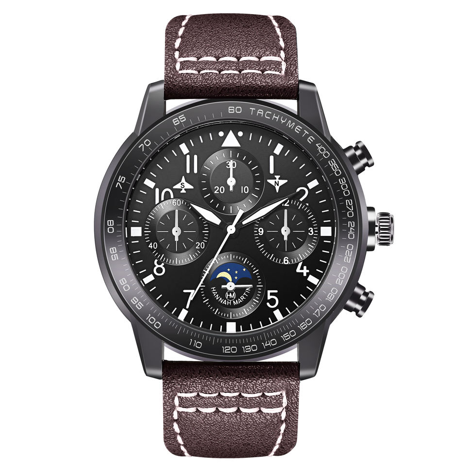 Montre à quartz pour homme, phase de lune, chronographe multifonction, 4 sous-cadrans, bracelet en cuir, montre-bracelet lumineuse tendance