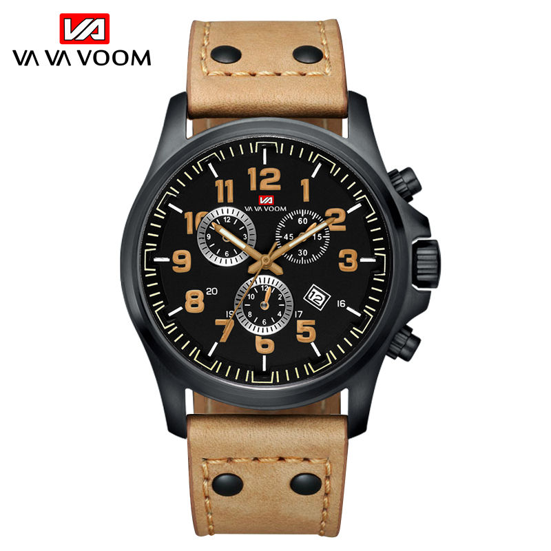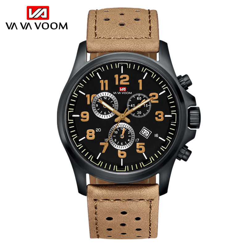 Montre chronographe de course pour homme, boîtier noir, accent doré, bracelet en cuir perforé, montre-bracelet de sport