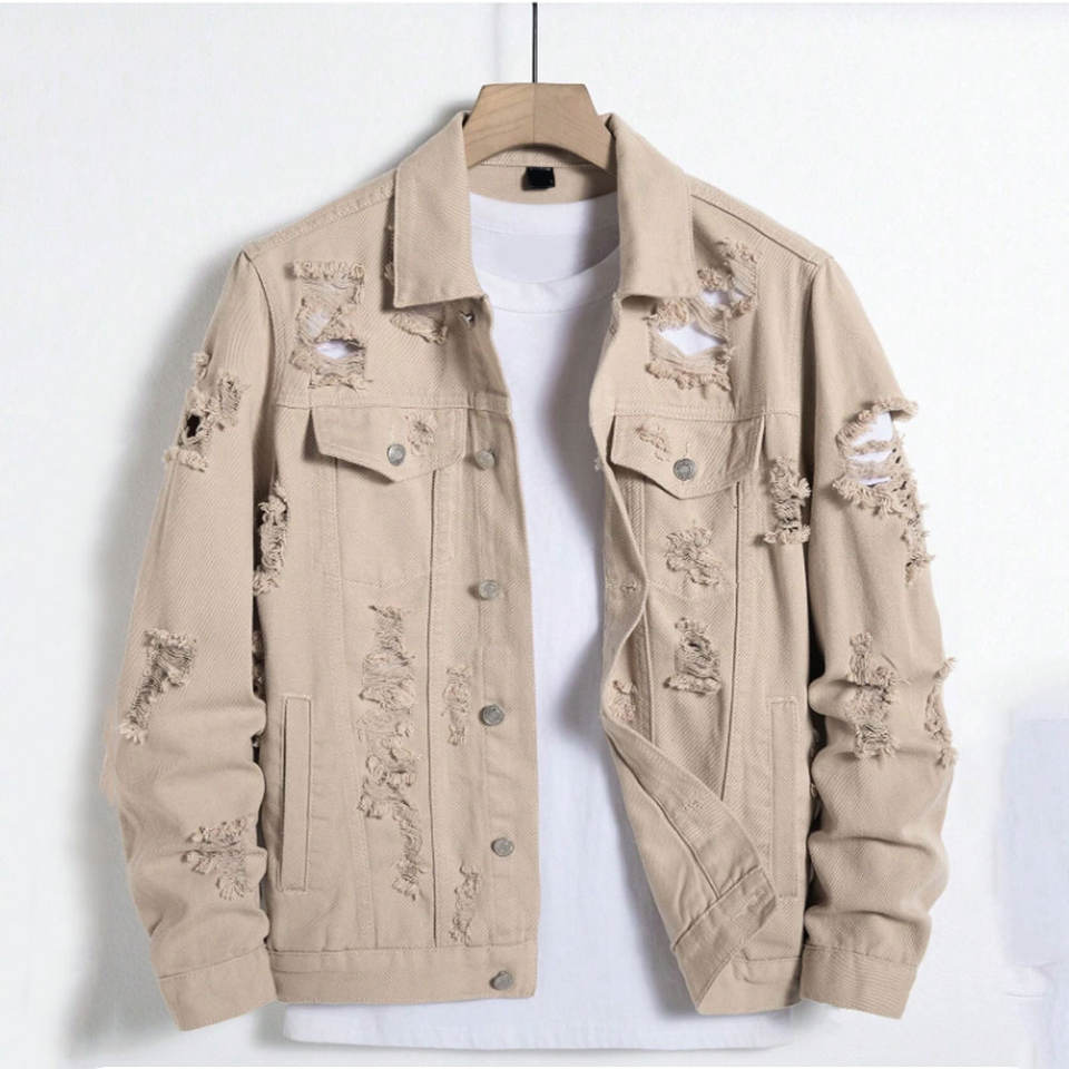 Veste en jean déchirée à poche à rabat effilochée pour hommes style rappeur de fête kaki uni avec poche à boutons kaki et vestes déchirées au design