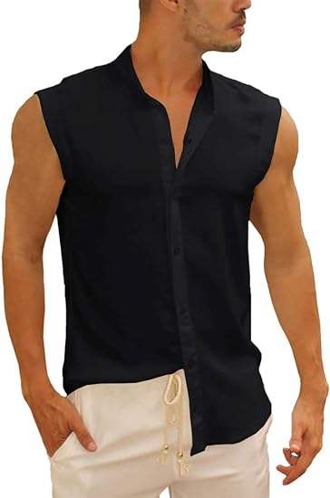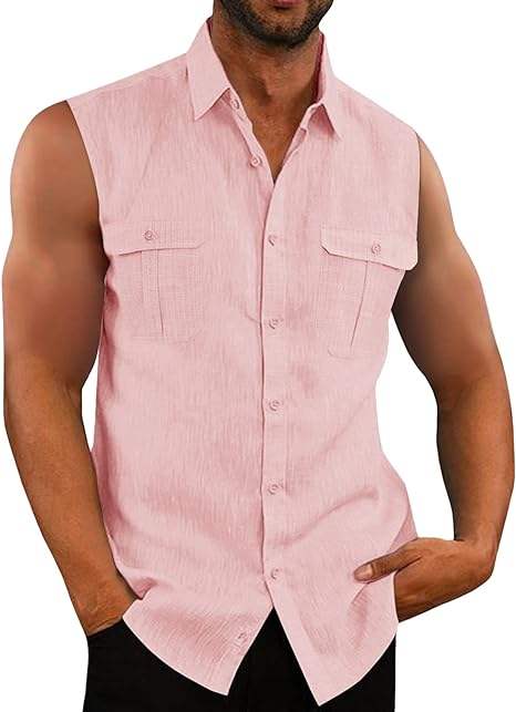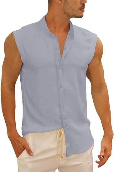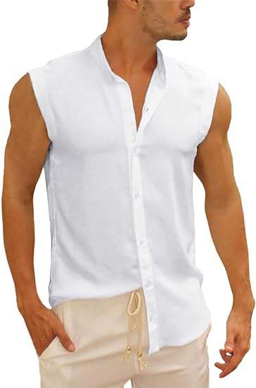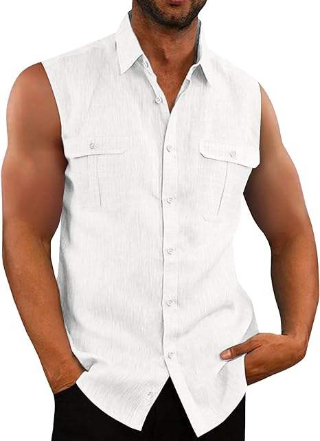 Chemises boutonnées sans manches pour hommes Lin Coton Summer Beach Basic Tank Tops T-Shirt
