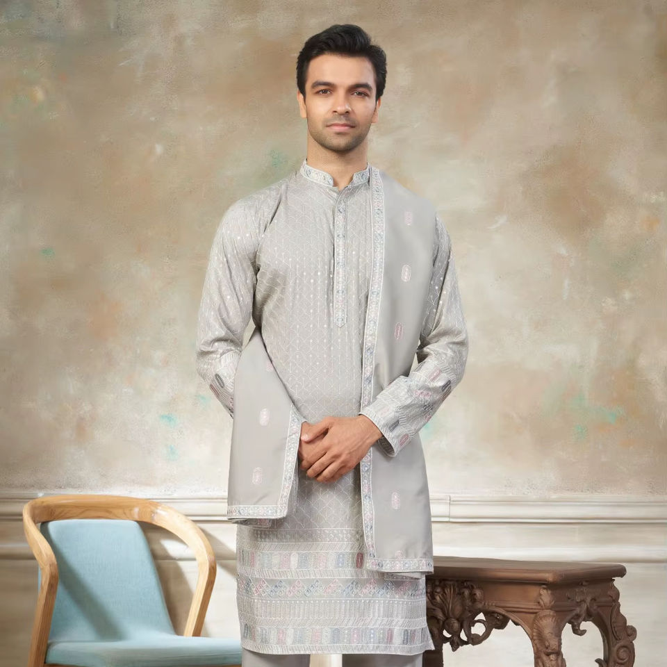 Ensemble Kurta Pyjama Traditionnel pour Hommes en Soie Pure avec Broderie et Dupatta Assorti pour Mariage et Diwali