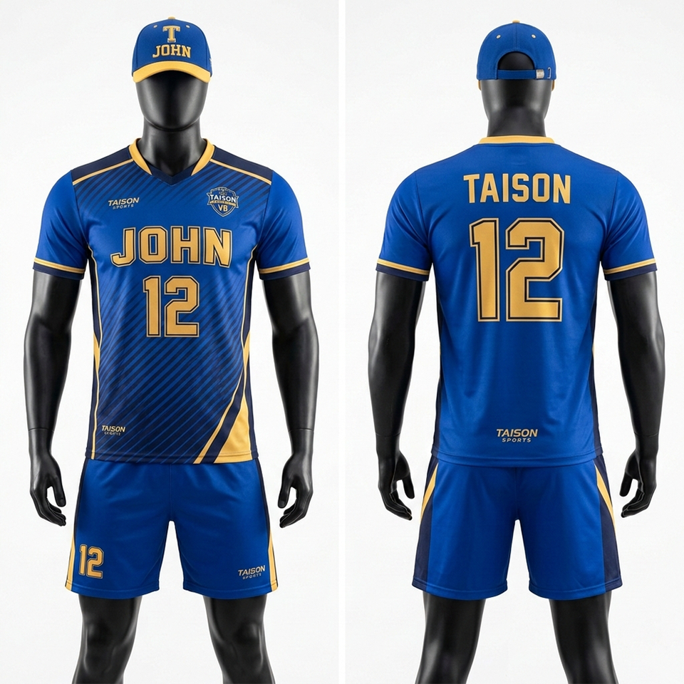 Tenue de volley-ball pour hommes en tissu polyester GSM doux, design à panneaux latéraux bleu et or, coupe athlétique, respirante, logo brodé personnalisé