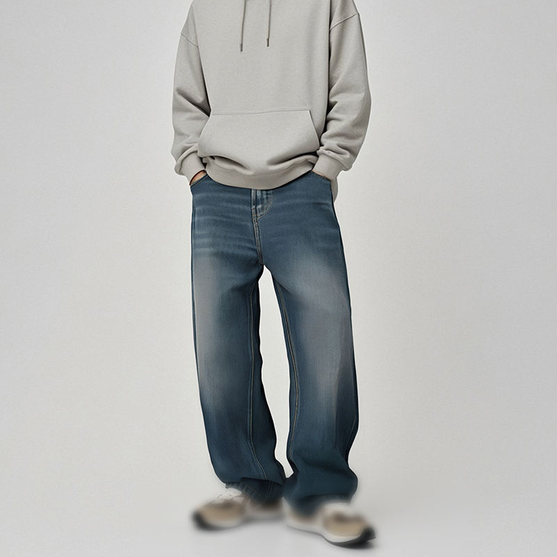 Mens and Womens Korean Style Four Seasons Retro Washed Wide Leg Jeans Straight Fit Semi Elastic Waist Long Denim Pants