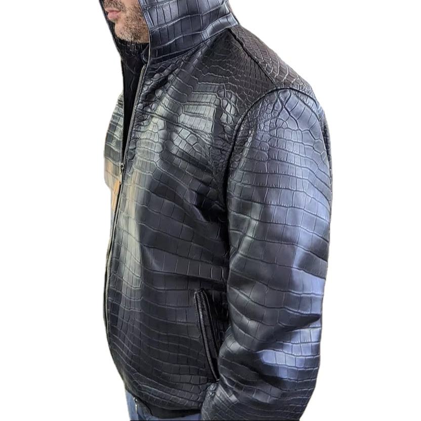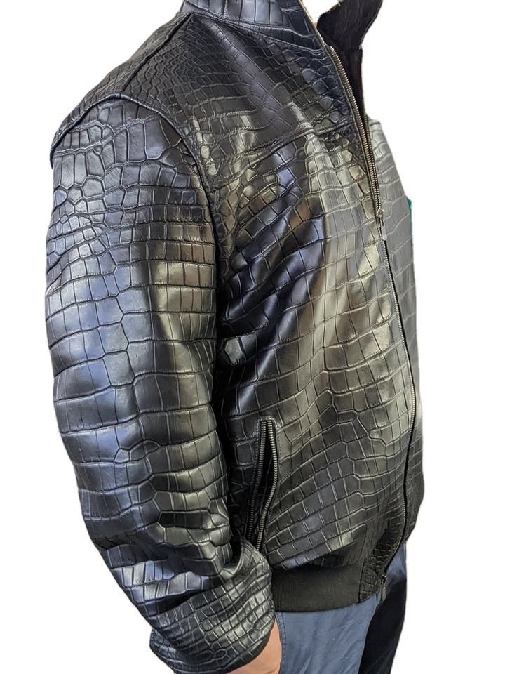 Black Real Crocodile Leather Jacket Deep Navy Blue Mens Crocodile Jacket Zip Up Biker Bomber Style Band Collar Coat
