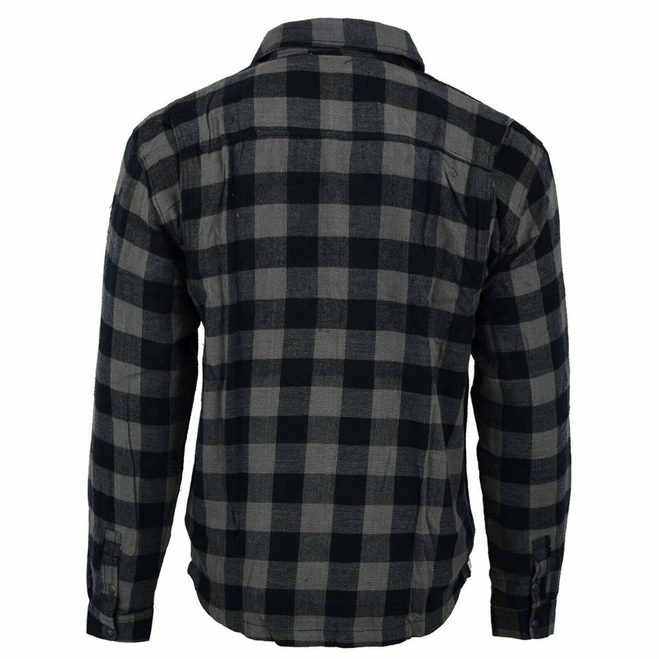 Mens motorcycle protection shirt in grey and black plaid with button-up front and two chest pockets for added safety
