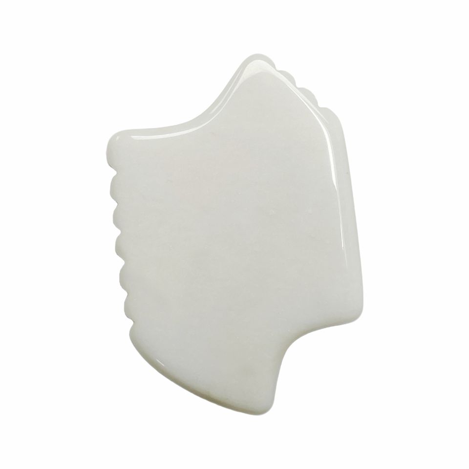 Planche de Gua Sha en jade blanc dentelé, ciblant les points méridiens.