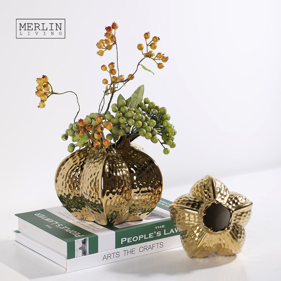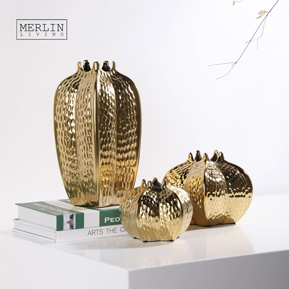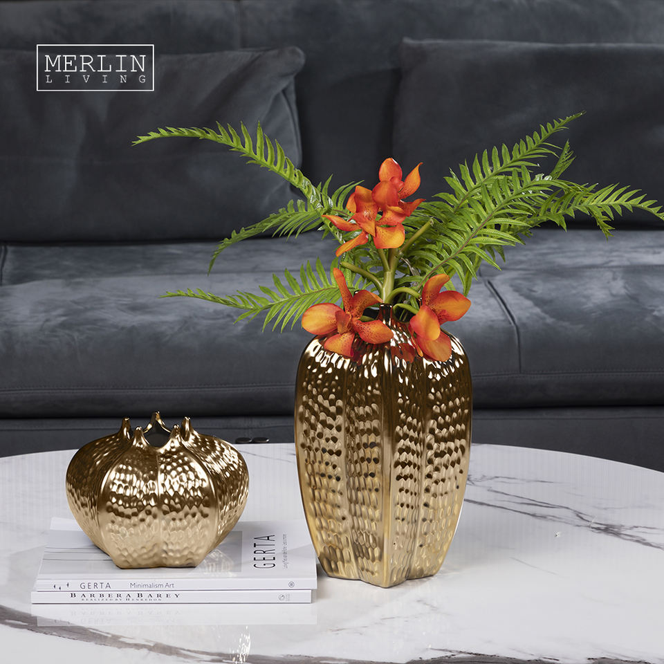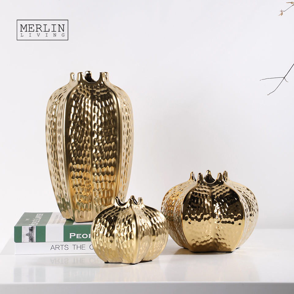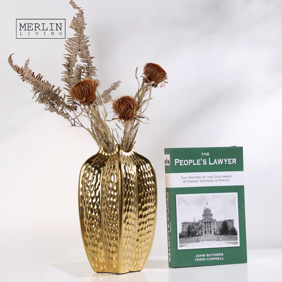 Vase doré texturé Merlin Living, forme couronne angulaire, ornement moderne et luxueux pour la maison, vase de table doré avec vase à fleurs