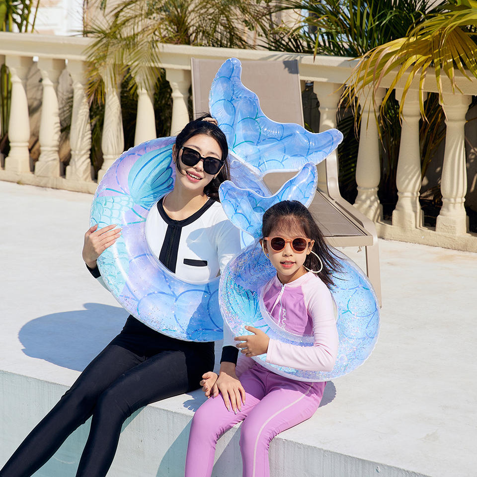 Bouée de natation sirène avec dossier et design queue de poisson, gonflable et épaissie, ornée de paillettes, pour adultes, utilisation en piscine et parc aquatique