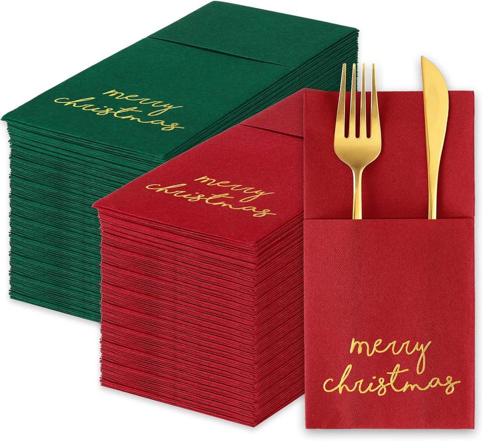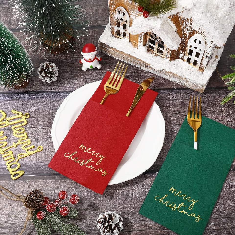 Serviette de table jetable en papier Airlaid rouge vert pré-pliée avec poche Joyeux Noël