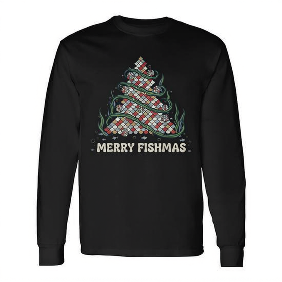T-shirt à manches longues Merry Fishmas Fishing Christmas Tree Retro Xmas