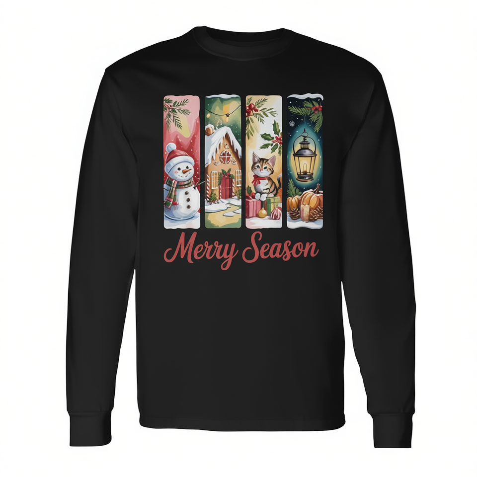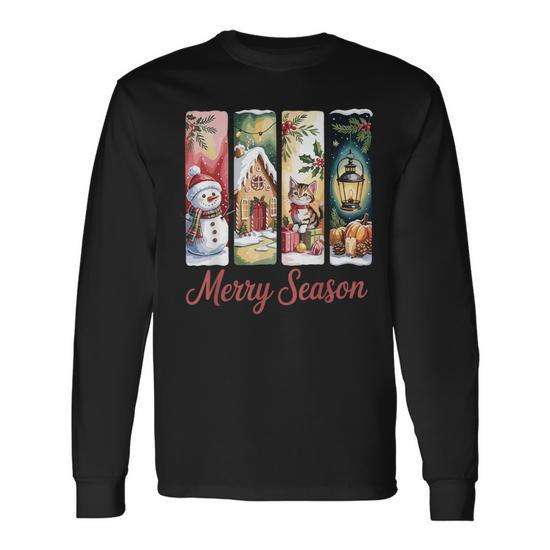 T-shirt à manches longues avec lanterne, motif bonhomme de neige, chat et maison en pain d'épices, saison des fêtes