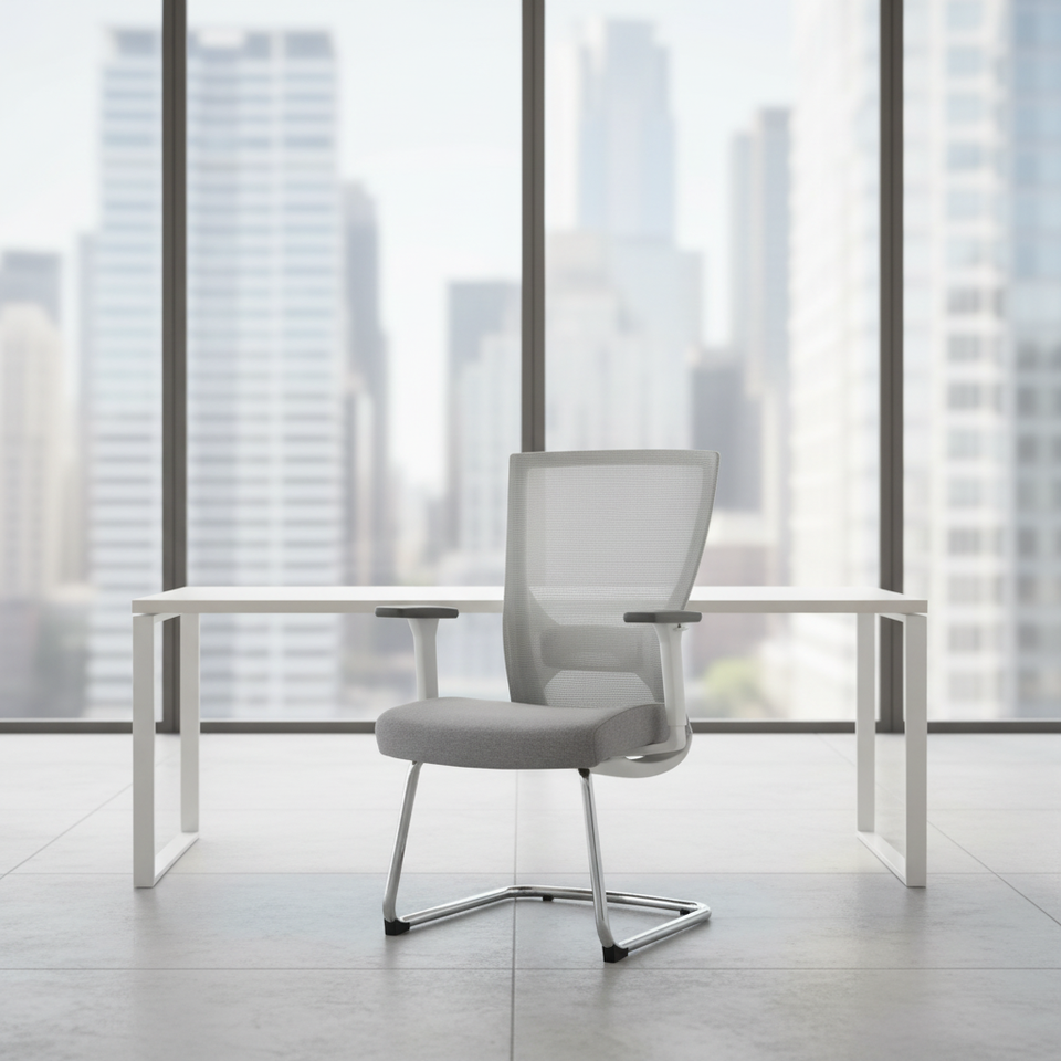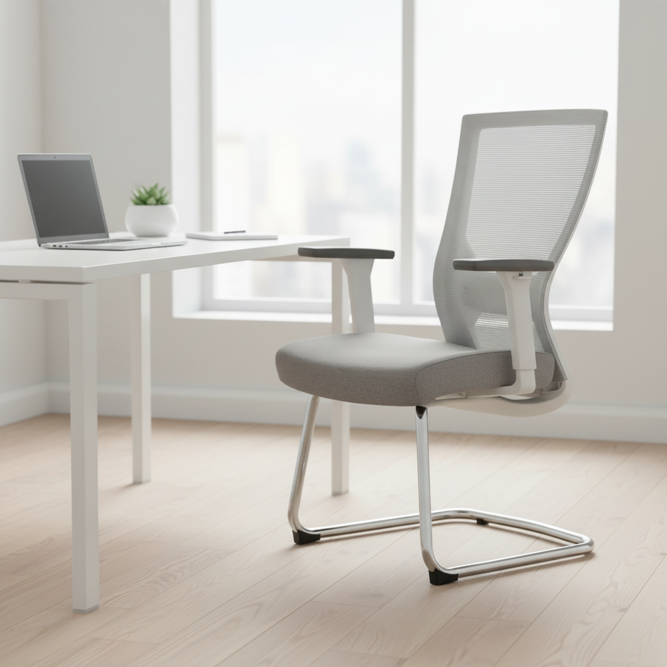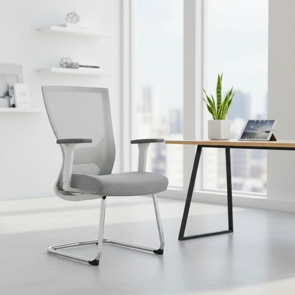 Chaise de bureau à dossier en maille, pieds fixes en métal, gris et blanc, chaise de réunion pour le personnel, respirante, confortable, chaise de réception, vente en gros