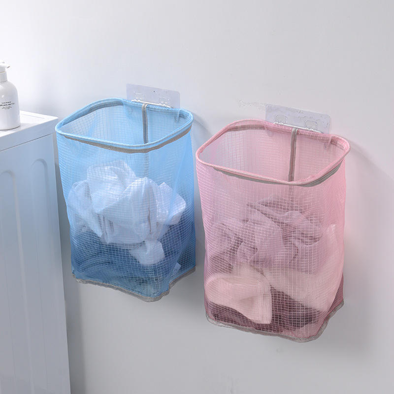 Panier à linge en maille rectangulaire rose et bleu ciel, à fixer au mur, sans perçage, pour vêtements et jouets