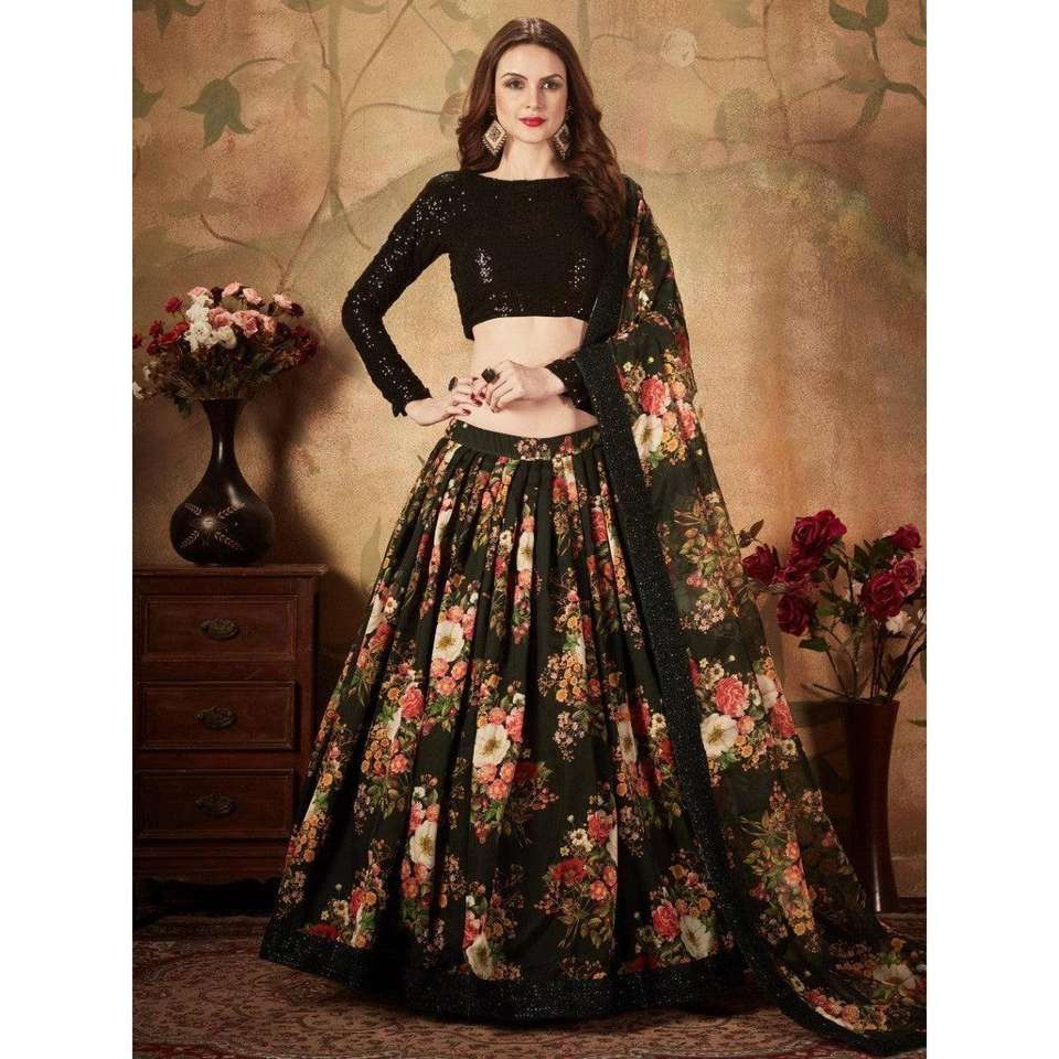 Mesmerizing Black Floral Print Organza Silk Wedding Lehenga Choli