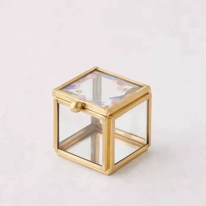 Boîte à bijoux en métal et en verre avec base en bois vieilli, couvercle transparent, style fermier