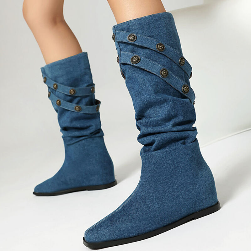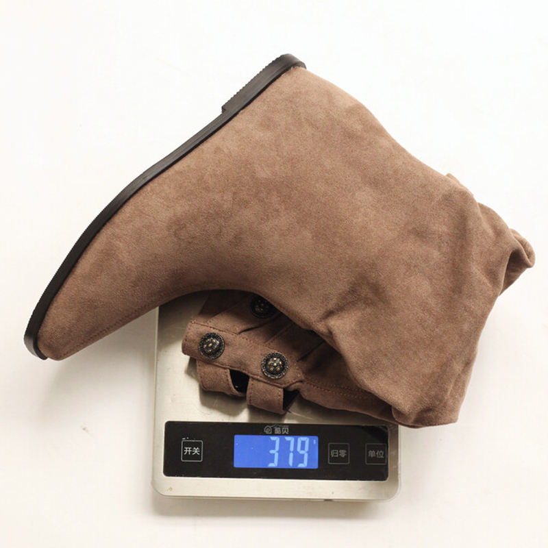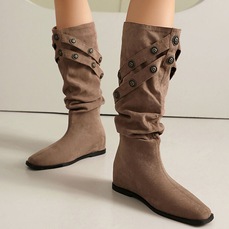 Bottes hautes pour femmes à bout carré, talons plats, en daim avec décorations boutons métalliques, coupe large