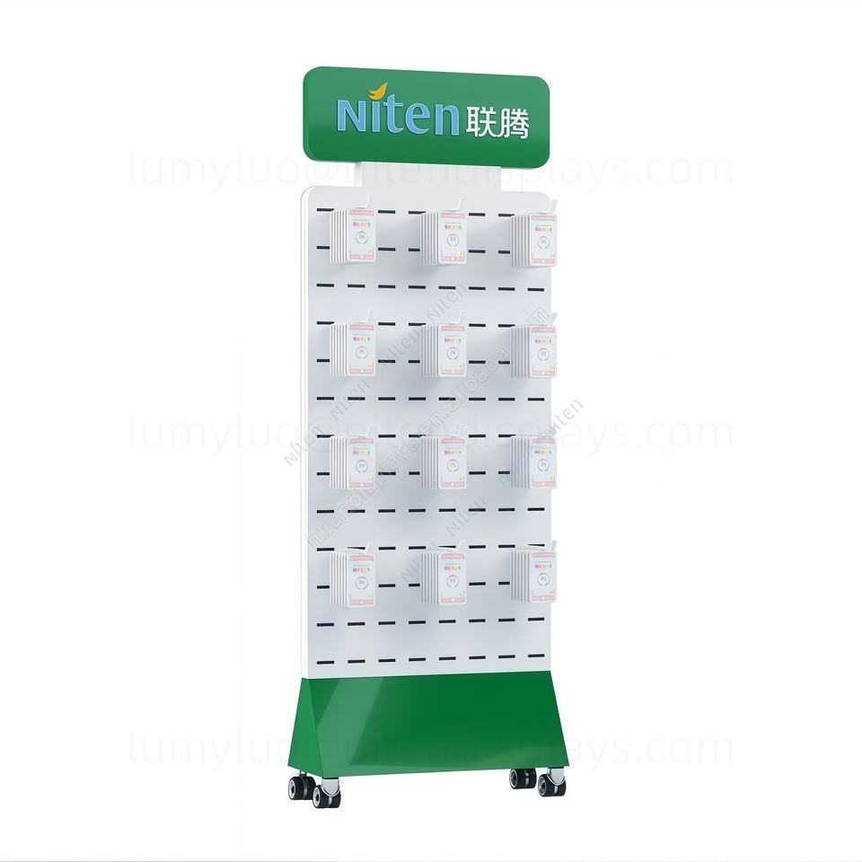 Support d'affichage double face en métal, accessoires pour téléphone, présentoir au sol avec crochets et 4 roues, présentoir de vente au détail roulant pour magasin