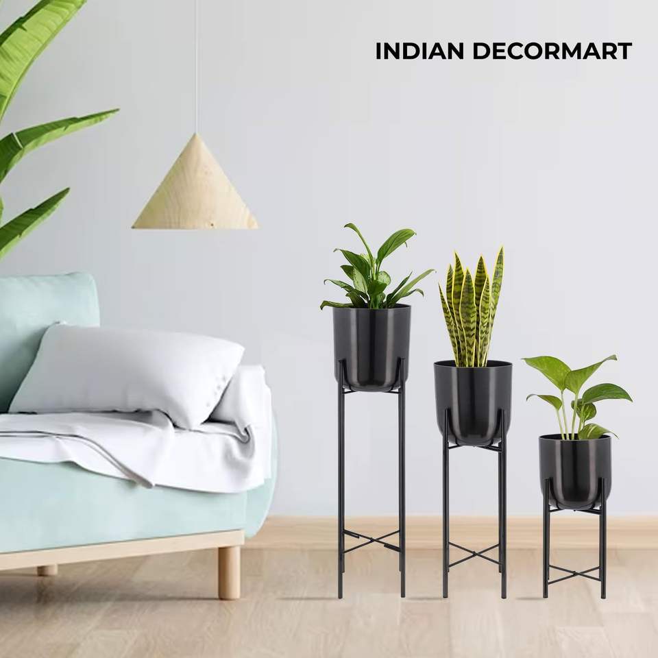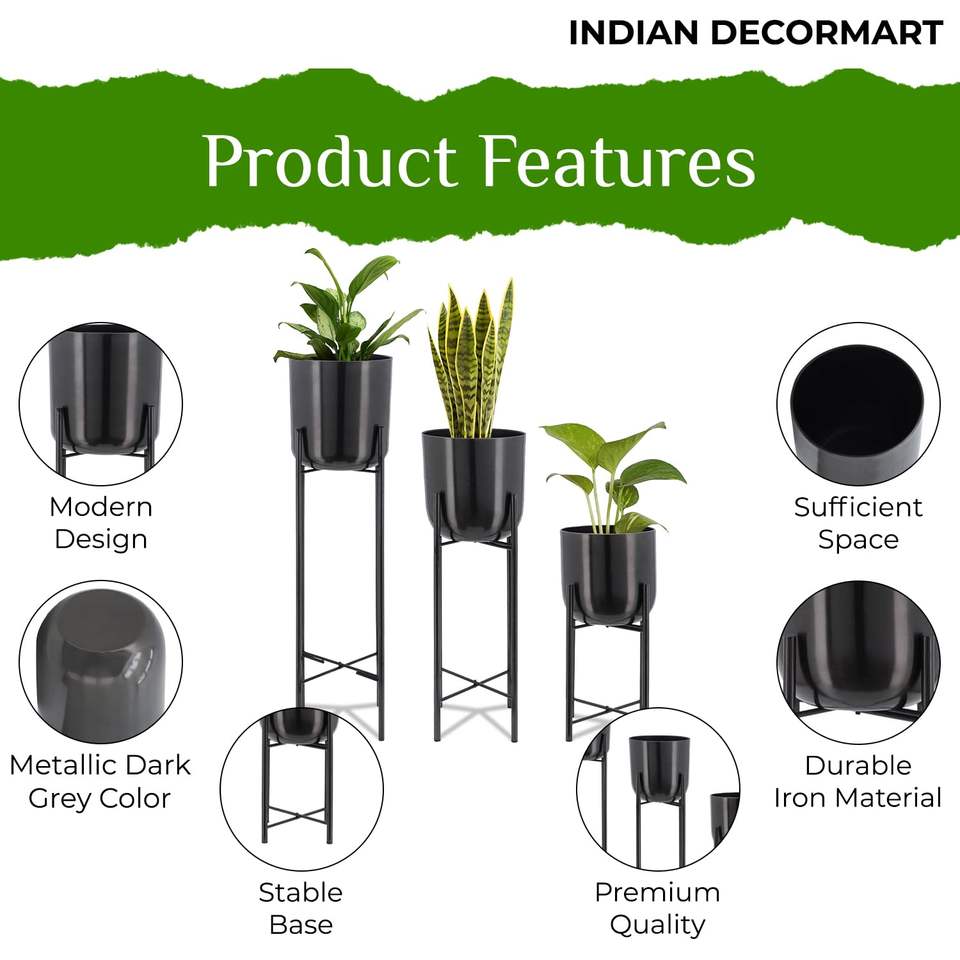 Lot de 3 pots de sol en métal idéal pour la décoration intérieure et extérieure de la maison avec support pour plantes en métal (gris foncé métallisé)