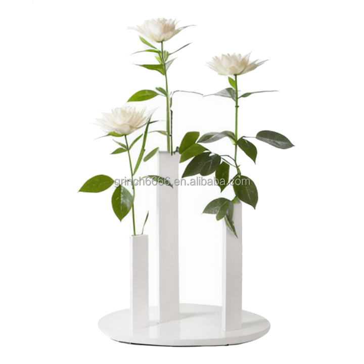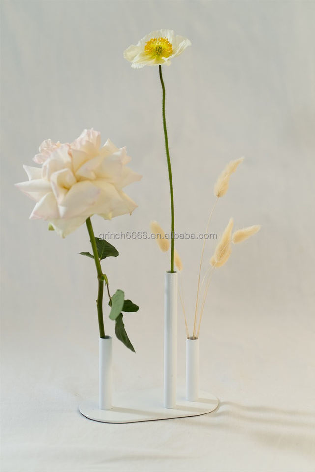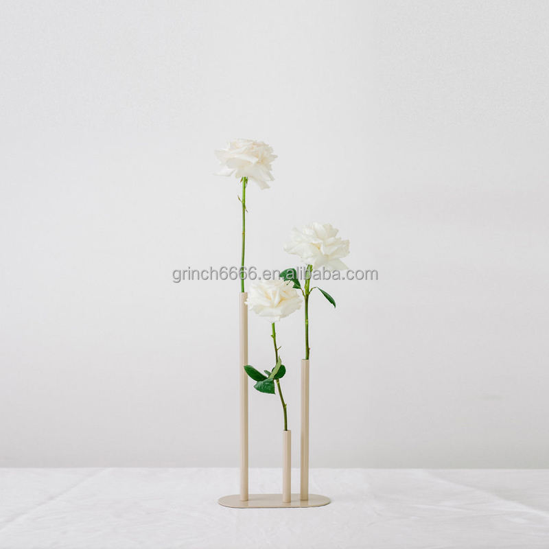 Vase floral en métal, support floral en chêne, vase à trois tiges pour fleurs, vase à bourgeons, centre de table de mariage, vases blancs, centre de table