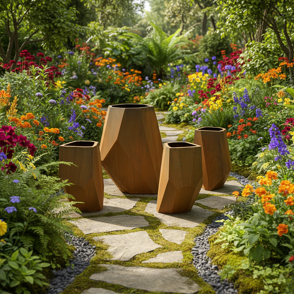 Boîte à fleurs en acier corten découpée au laser, grande, sculpturale