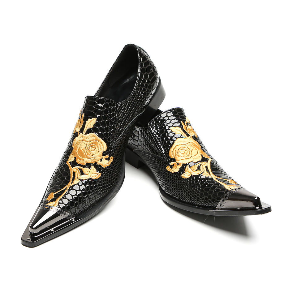 Métal bout pointu fleur broderie hommes en cuir véritable chaussures habillées grande taille sans lacet décontracté chaussures d'affaires hommes chaussures formelles