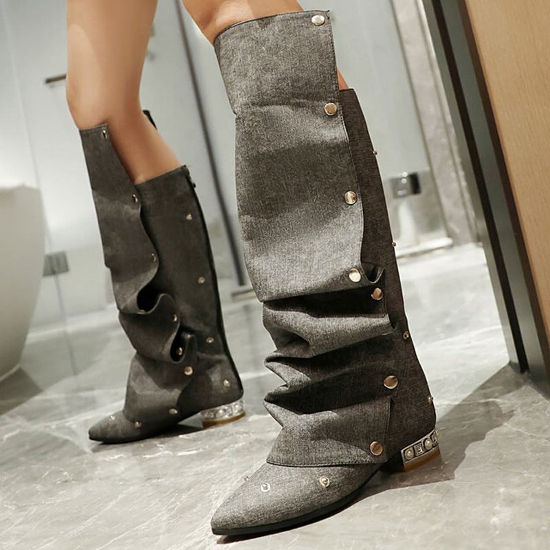 Bottes hautes en jean pour femme, grande taille 48, coupe large, avec rivets métalliques, tige plissée, talons carrés bas
