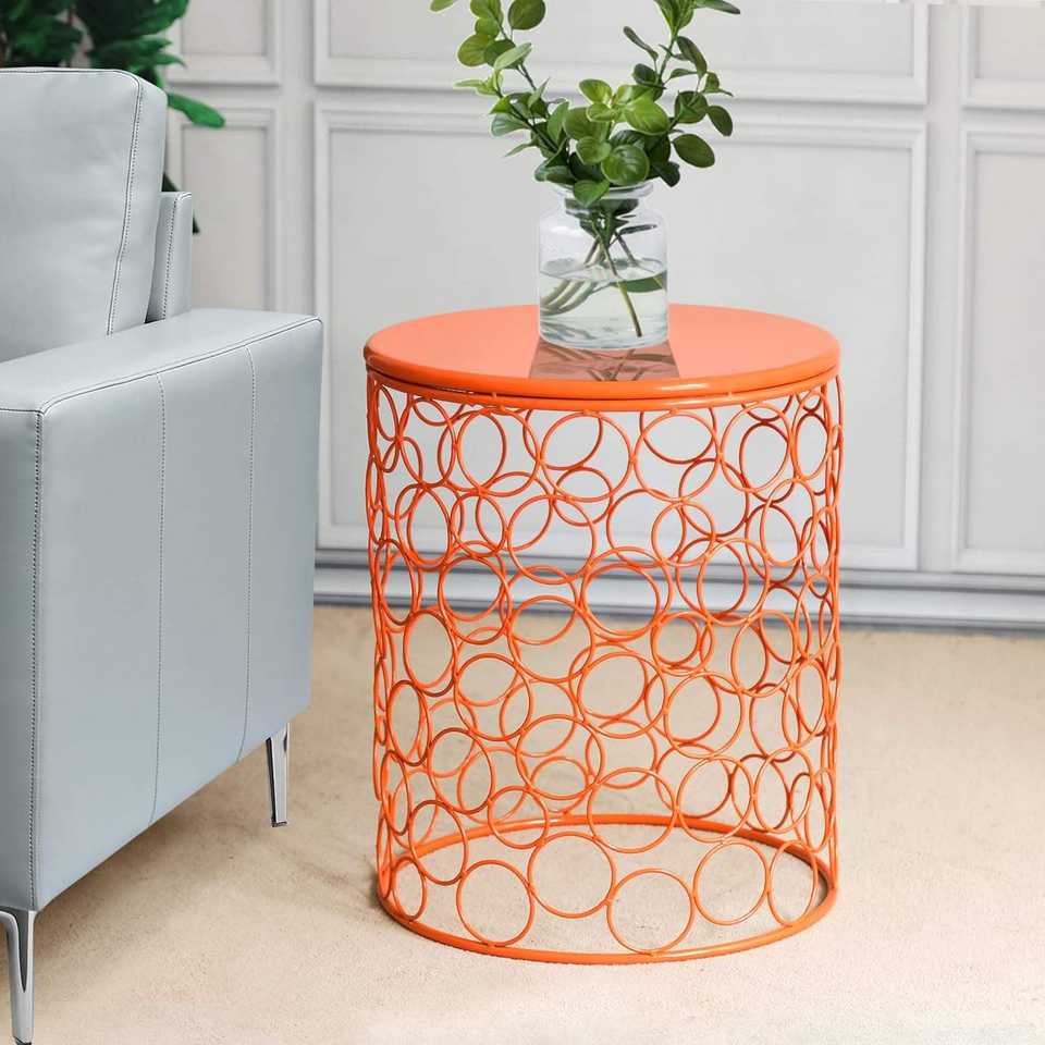 Table d'appoint en fil métallique finition orange, support pour plantes, table basse, meuble de salon, mobilier de maison, intérieur, moderne, décoratif, bureau rond