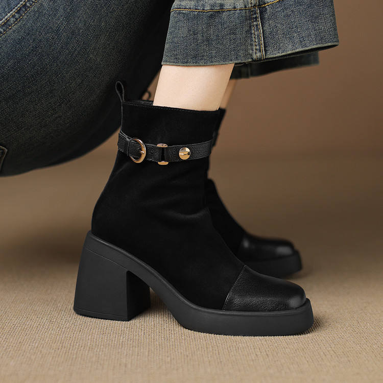 Bottines en cuir à bout carré avec ceinture métallique, style rétro classique, décontracté, tempérament, talon ultra haut, tendance, toutes occasions