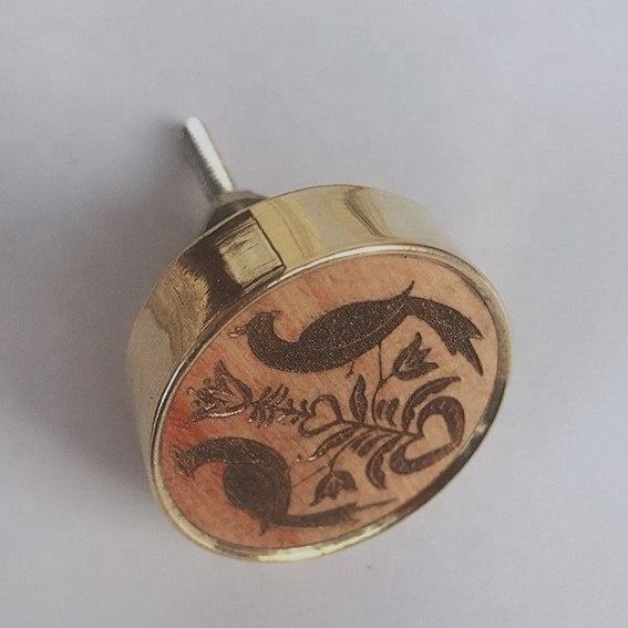 Bouton de tiroir rond en bois avec gravure de fleur de paon métallique pour armoire et commode par Lametierartz