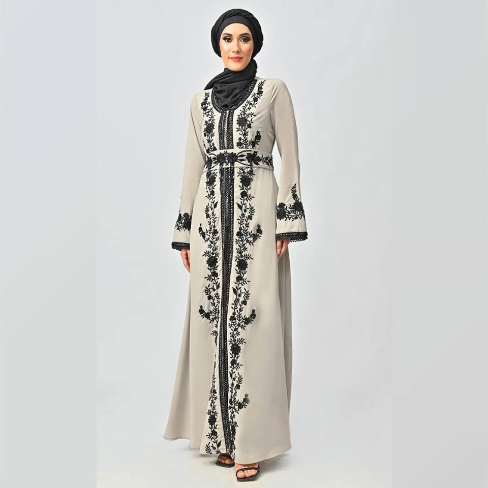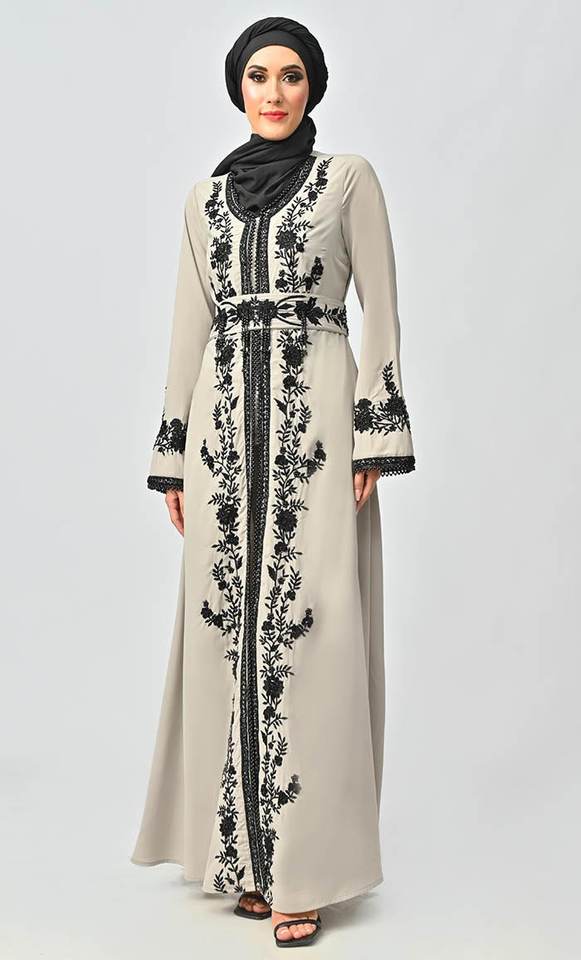 Mexico Style Party Satin Natural Waistline Sequins and Zari Work Abaya with Hijab Belt and Pockets