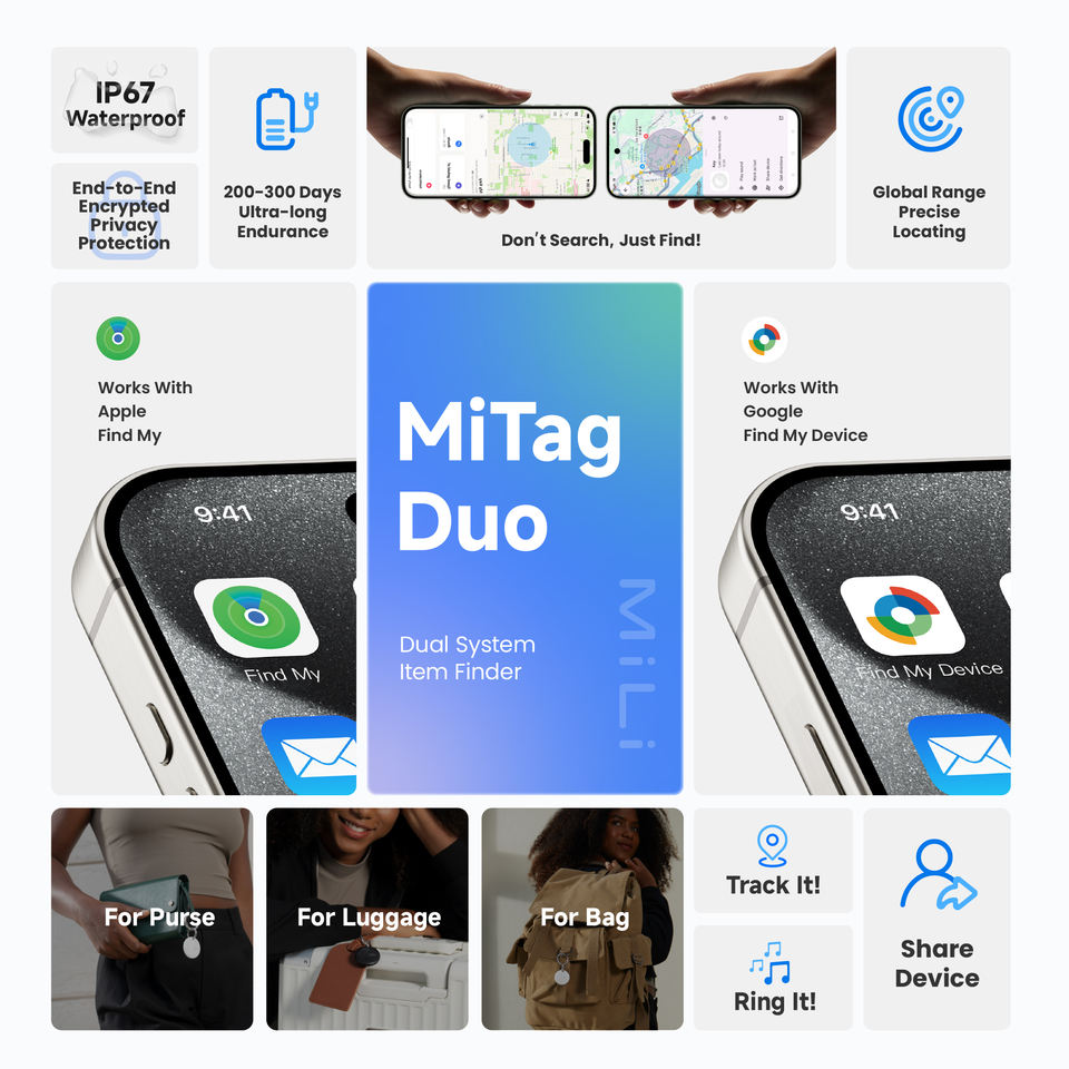 MiLi MiTag Duo Lot de 4 Traceurs GPS Intelligents Étanche IP67 pour Clés, Bagages et Objets – Anti-Perte