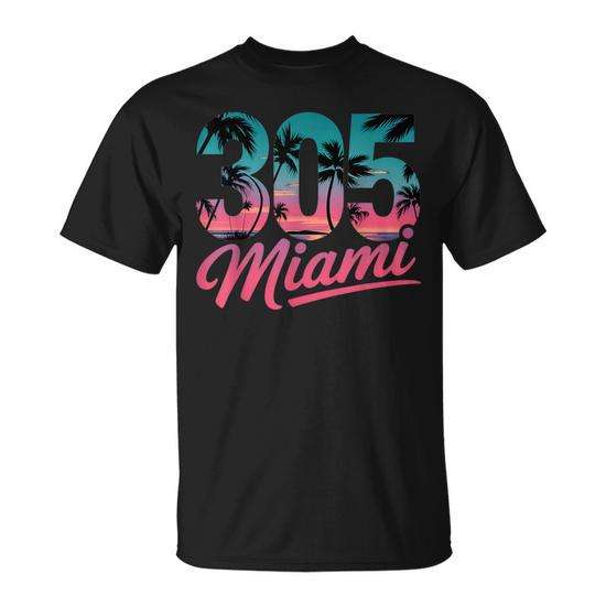 T-shirt Rétro Unisexe Col Rond Manches Courtes avec Palmiers Vintage et Code Postal 305 de Miami, pour Activités Promotionnelles, Sérigraphie