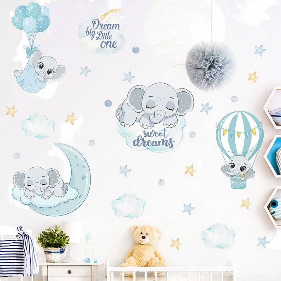 Autocollant en PVC découpé à la forme, imperméable, motif éléphant de dessin animé avec nuage, nouvelle conception Miaofu, pour la décoration murale de la chambre d'un bébé garçon