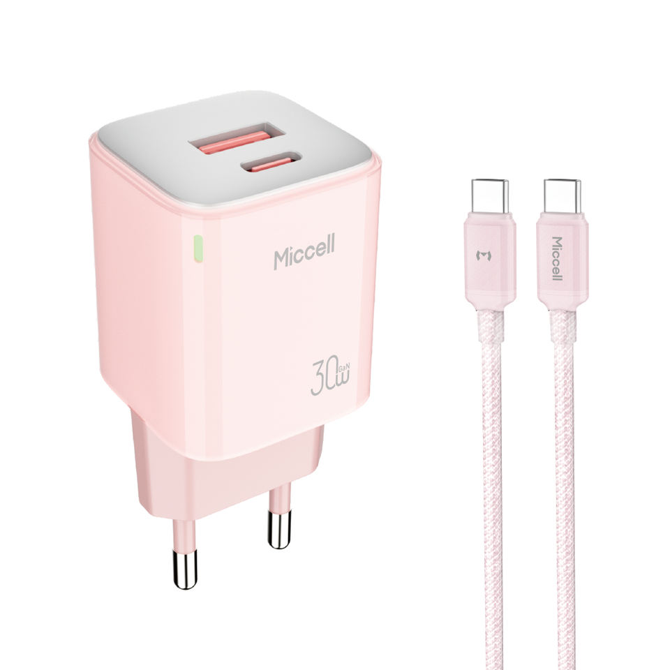 Chargeur compact GaN Miccell avec alimentation PD 30W et deux ports USB-C pour les utilisateurs d'iPhone, de Samsung et les voyageurs d'affaires