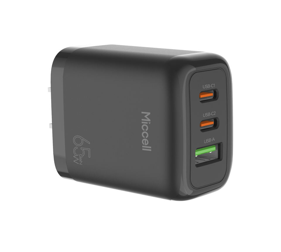 Miccell T12 Portable 65W GaN 3 ports Type-C PD 3.0 Chargeur mural pour ordinateur portable et téléphone portable avec protection OTP/OVP