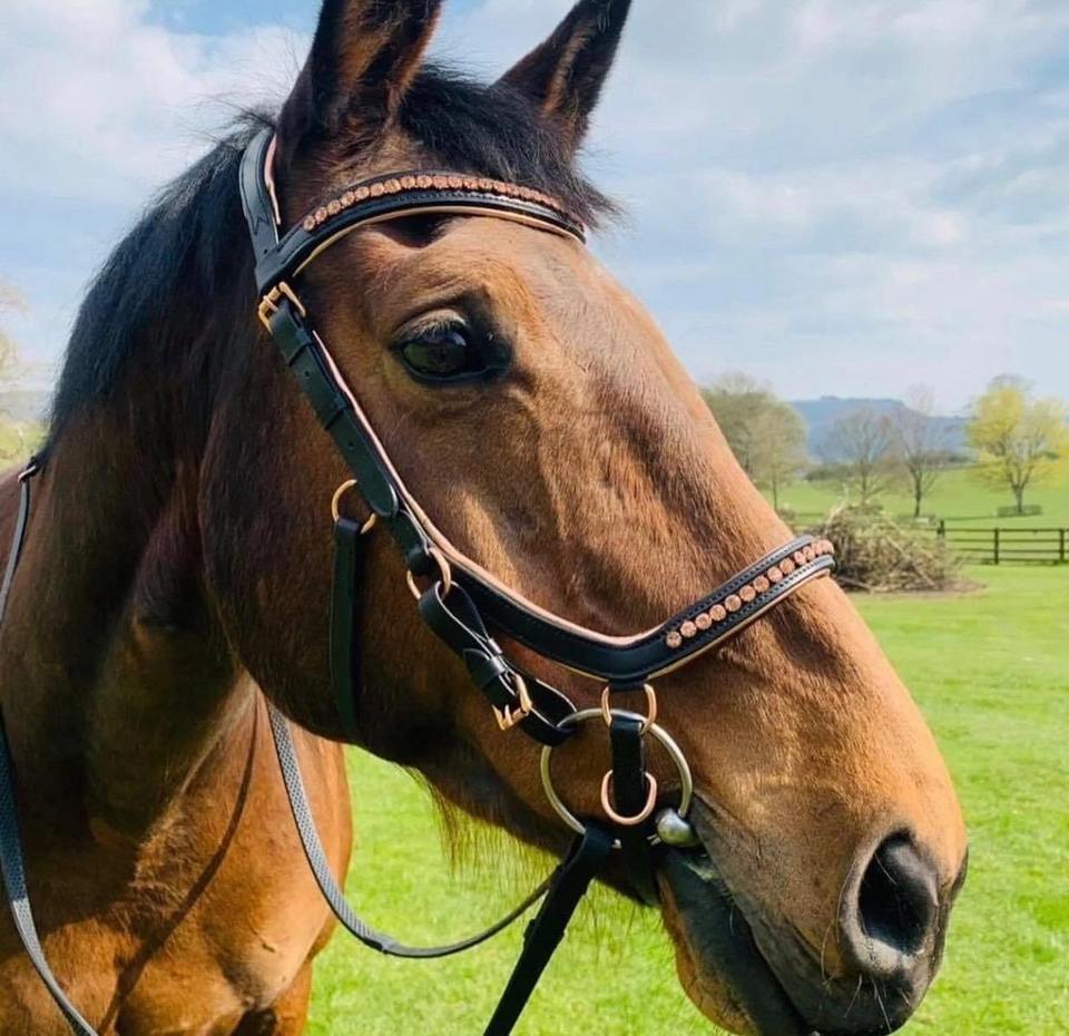 Ensemble en cuir de bride marron anatomique Micklem avec rênes entièrement rembourrées Accessoires équestres en or rose pour l'équitation