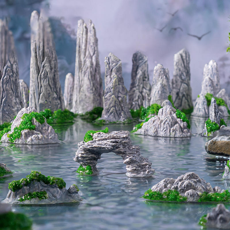 Figurine micro-landscape créative et mignonne, décoration de montagne artificielle en résine, radeau en bambou, paysage artisanal pour bureau