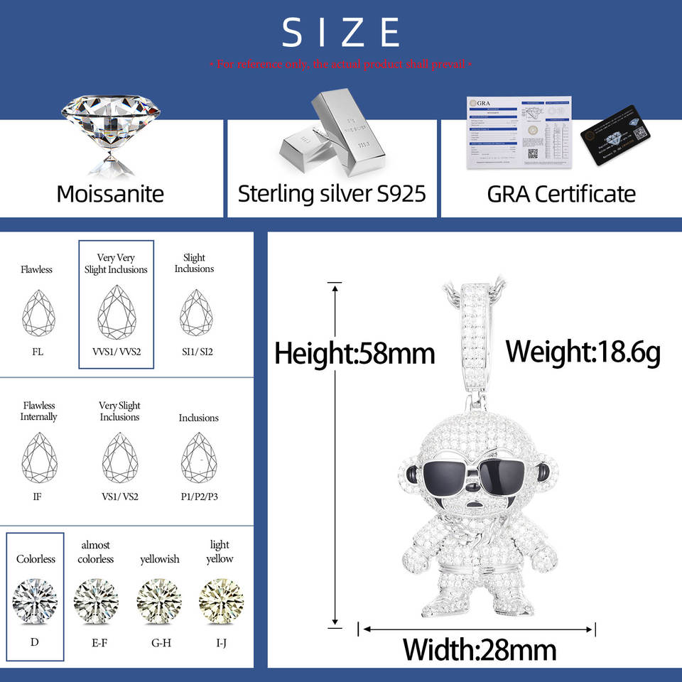 Pendentif singe en moissanite micro-pavée, haute qualité, plaqué or blanc S925, émail, bijoux glacés, collier de dessin animé