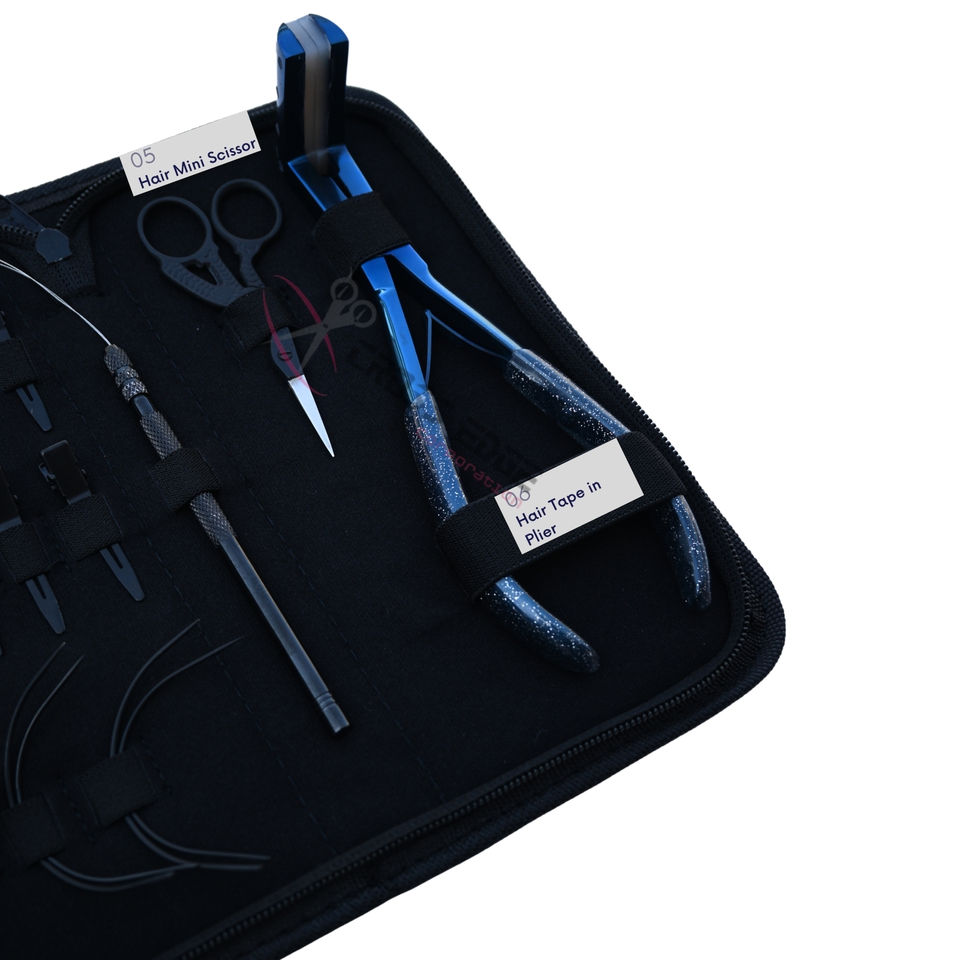 Trousse d'outils pour technicien(ne) d'extensions capillaires avec pince à bandes adhésives bleues, Outil de pose d'extensions adhésives pour salon de coiffure : pince à boucle, mini-ciseaux