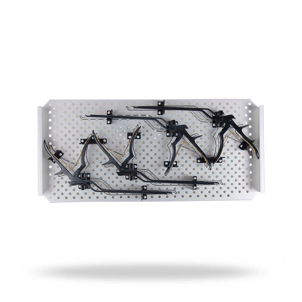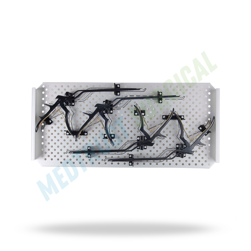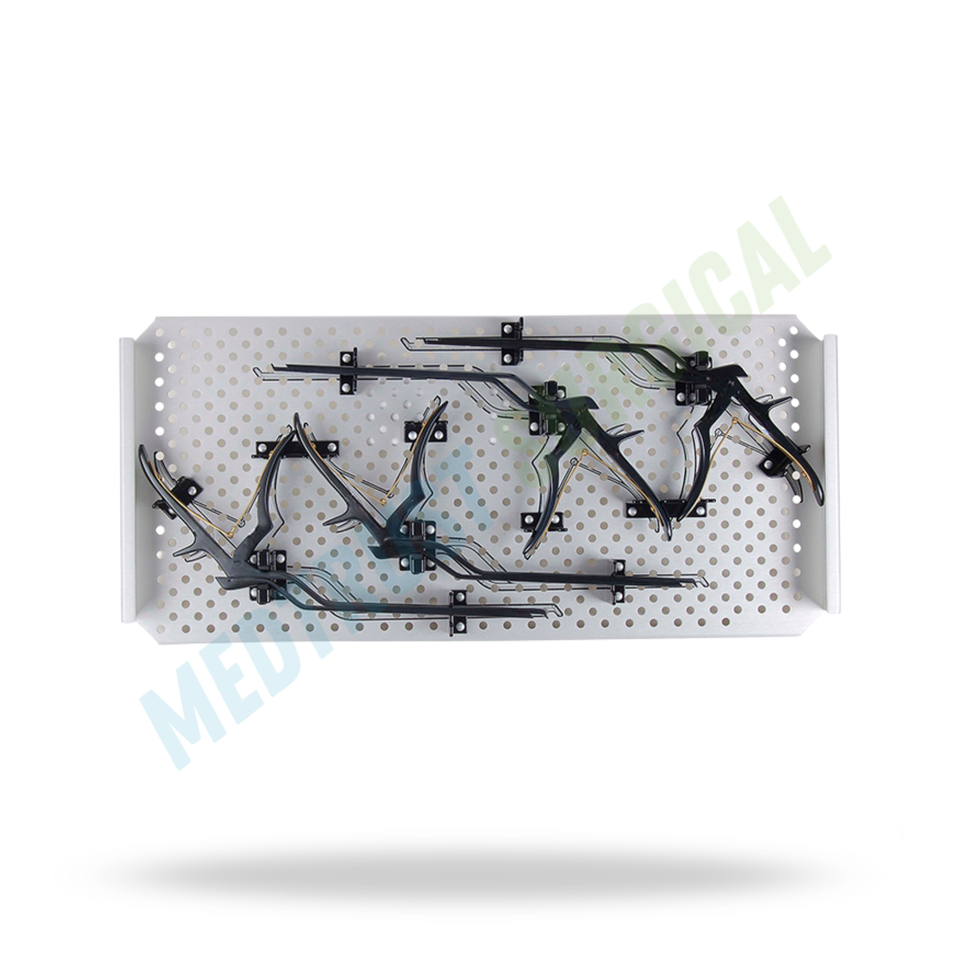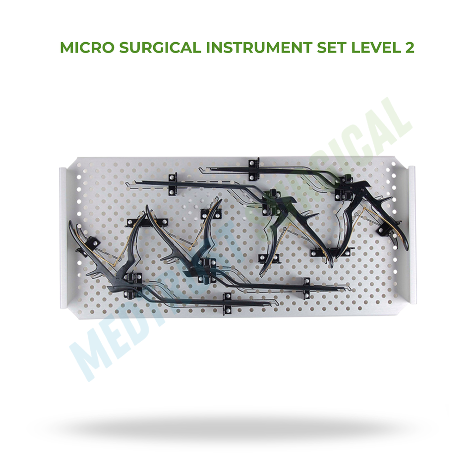 Spécification:Set d'instruments microchirurgicaux de niveau 2 avec outils avancés disposés dans un plateau de stérilisation pour procédures neurochirurgicales et de la colonne vertébrale