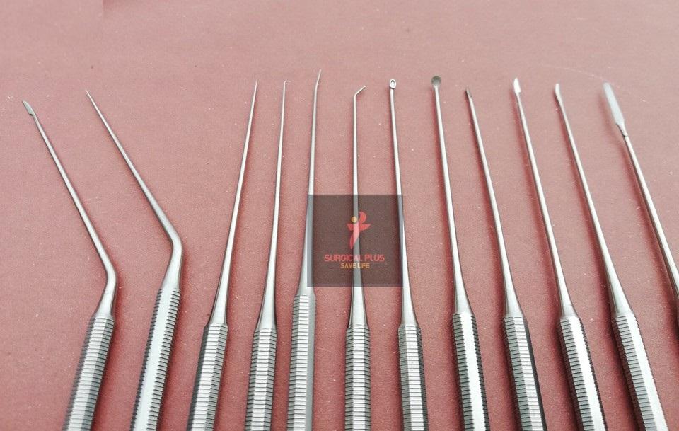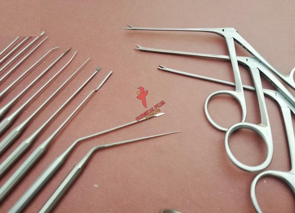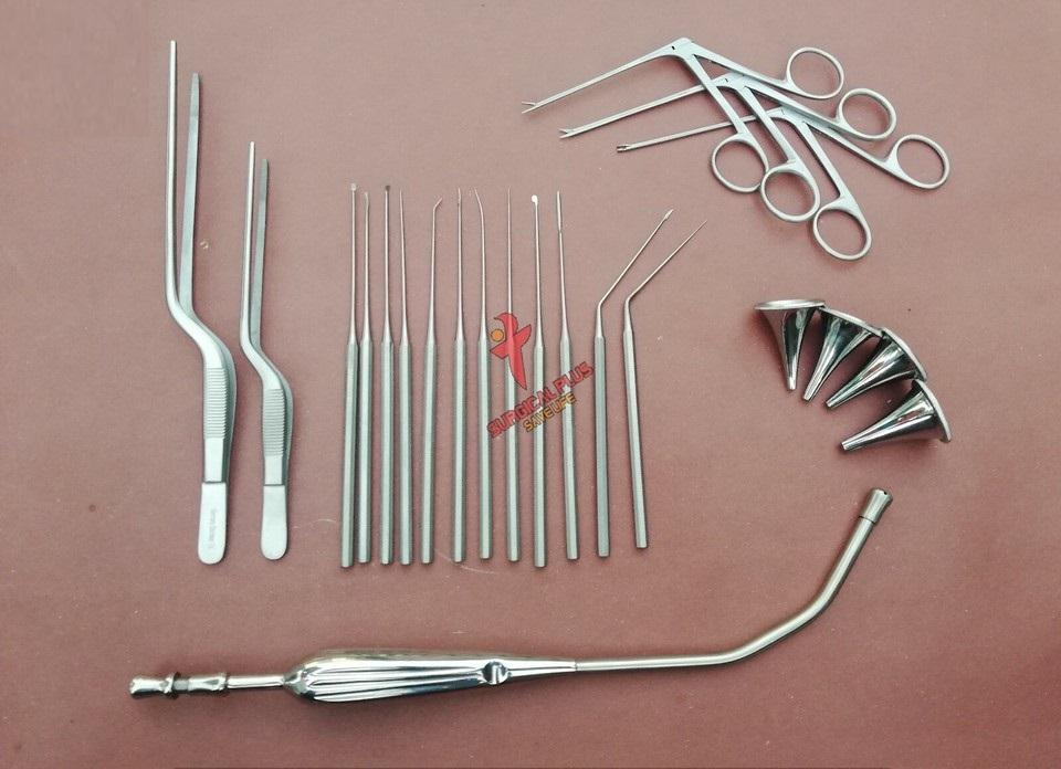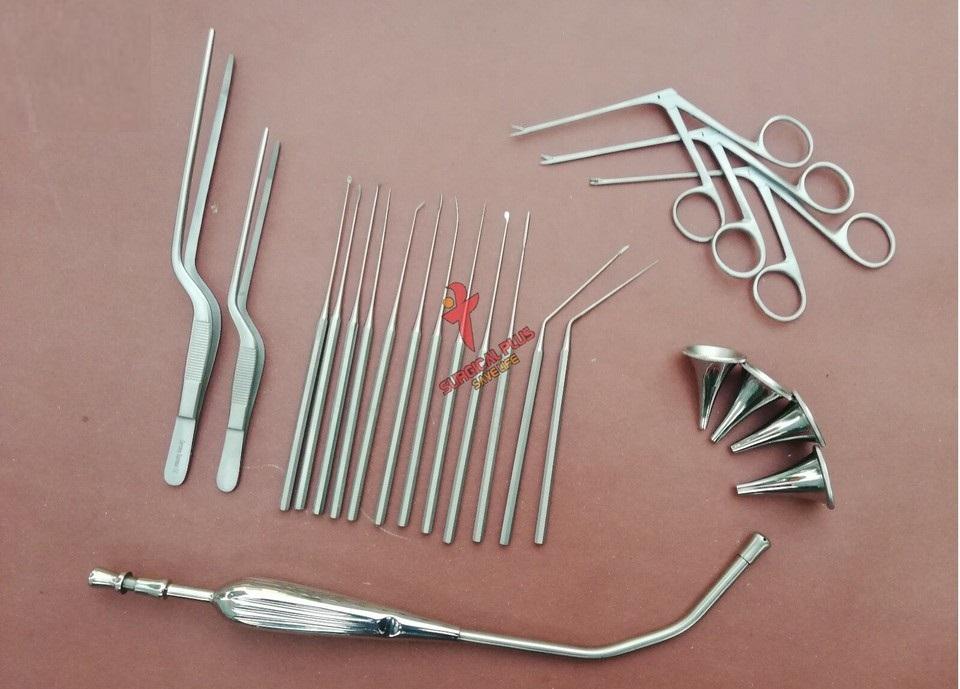 Micro-kératine, pinces auriculaires de Hartmann, canule et tube d'aspiration, set ORL de 22 pièces