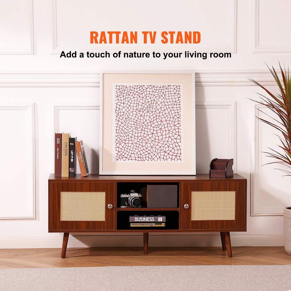 Meuble TV en rotin de style Mid-Century Modern, meuble TV bohème avec étagères réglables pour téléviseur de 55 pouces, console Livi