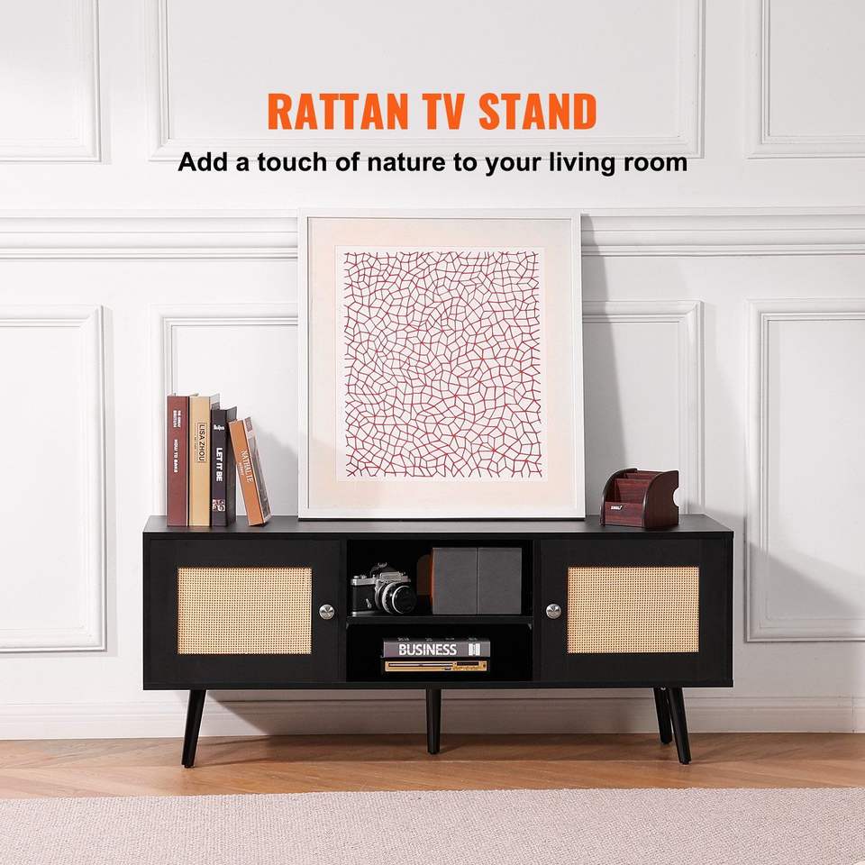 Meuble TV en rotin de style Mid-Century Modern, meuble TV bohème pour téléviseur de 55 pouces, étagères réglables, console TV Livi