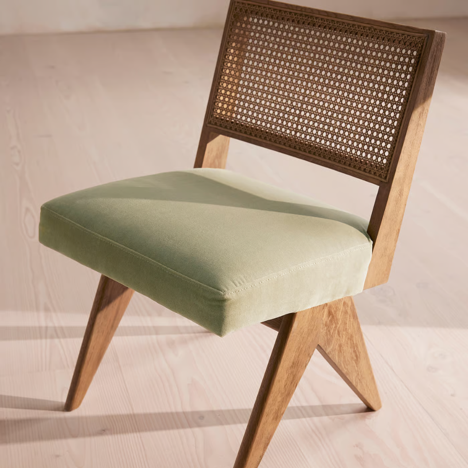 Chaise de salle à manger moderne du milieu du siècle pour la maison, l'appartement et le parc avec cadre en bois massif et dos de canne tissé en tissu crème