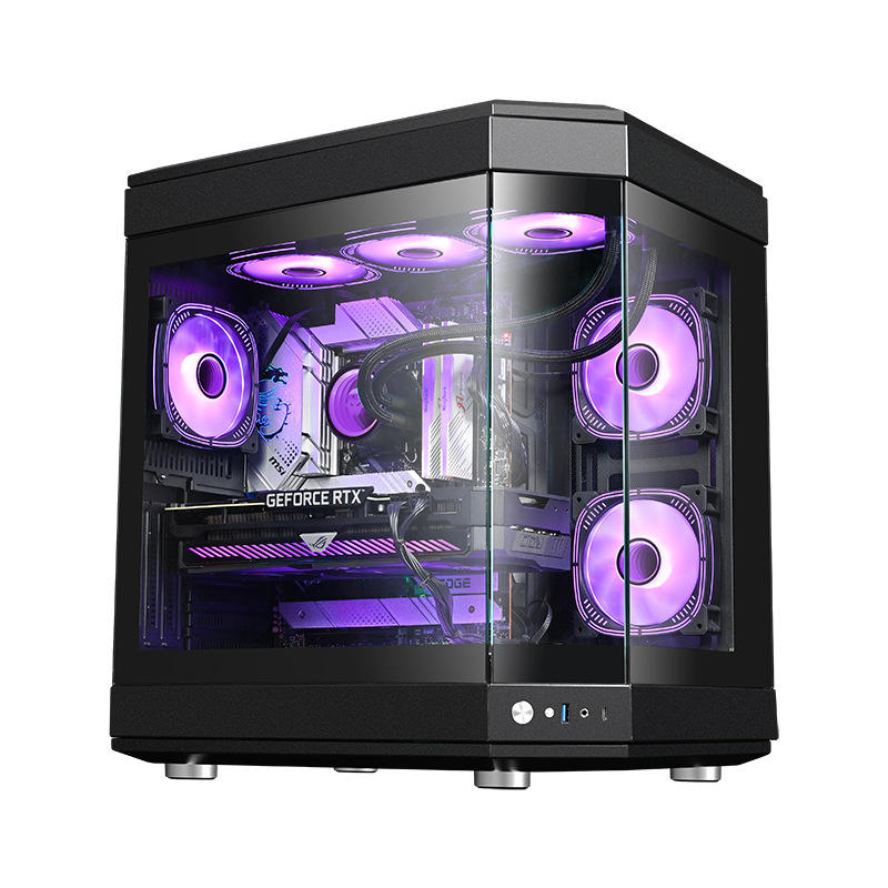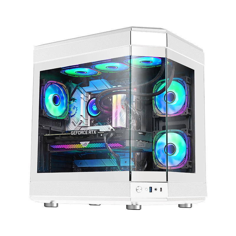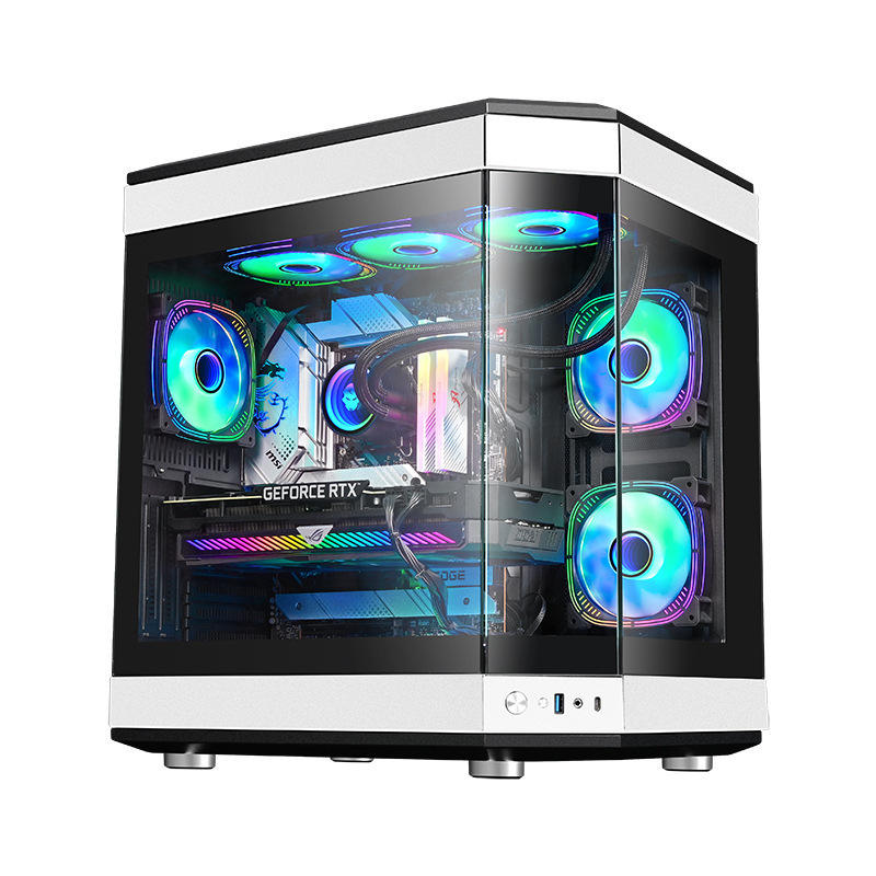 Boîtier PC ATX de grande taille à refroidissement par eau 360 degrés, châssis de tour moyenne, trois panneaux en verre, vue panoramique latérale, aquarium, vue sur la mer