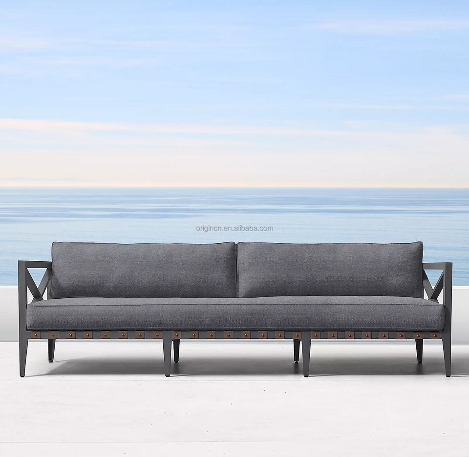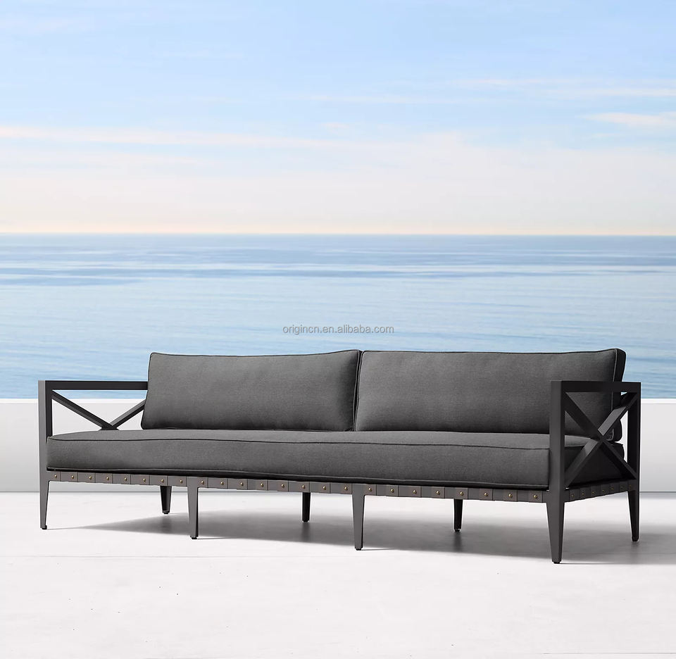 Meubles en aluminium aux éléments classiques du modernisme du milieu du siècle, élégant canapé d'amour, ensemble de canapés de jardin extérieur
