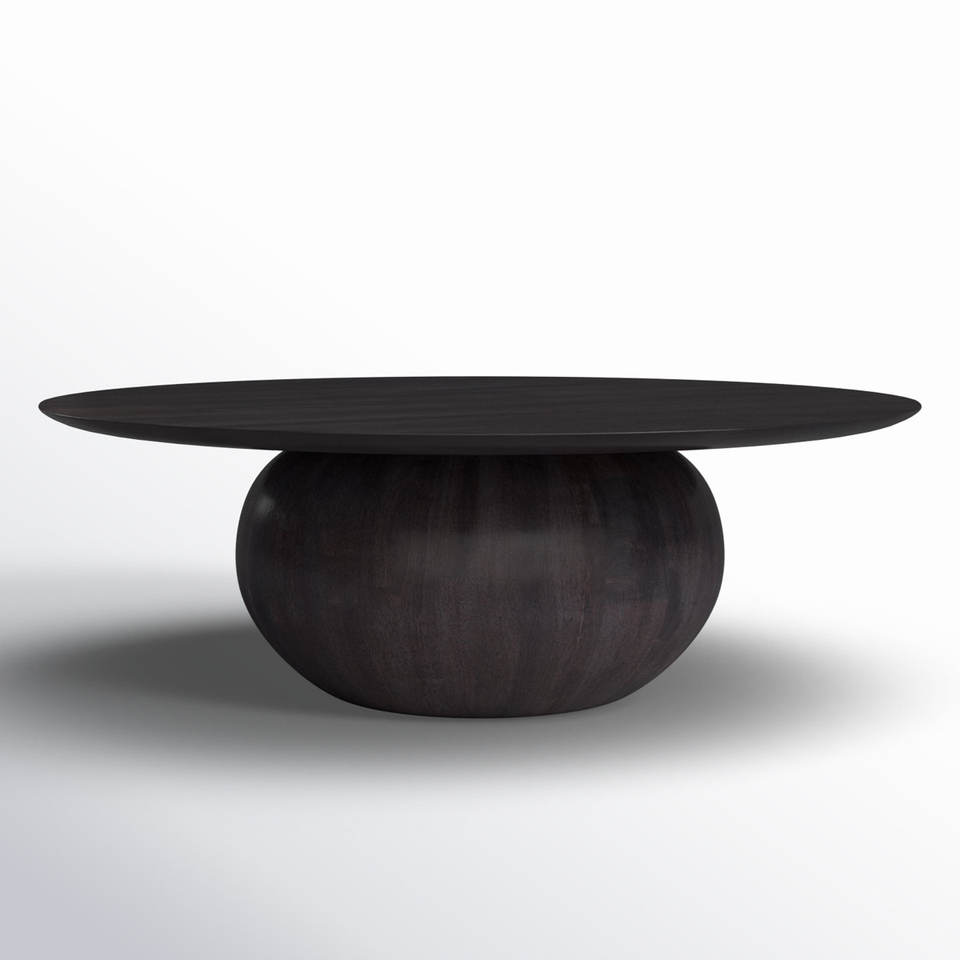 Table basse en noyer de style milieu du siècle avec un design rond doux, construction entièrement en bois et base architecturale moderne