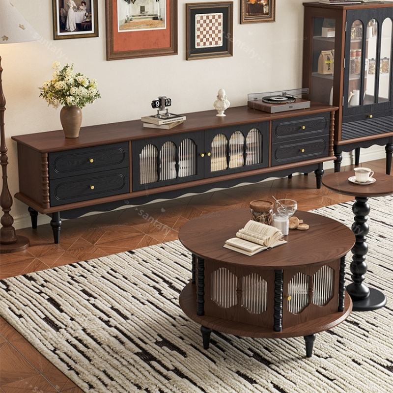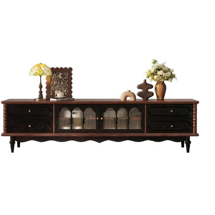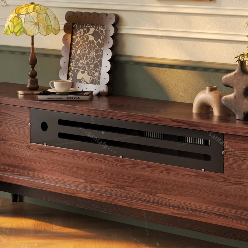 Meuble TV multi-niveaux de style mid-century en bois massif et stratifié, gain de place, avec rangement pour salon et salle à manger